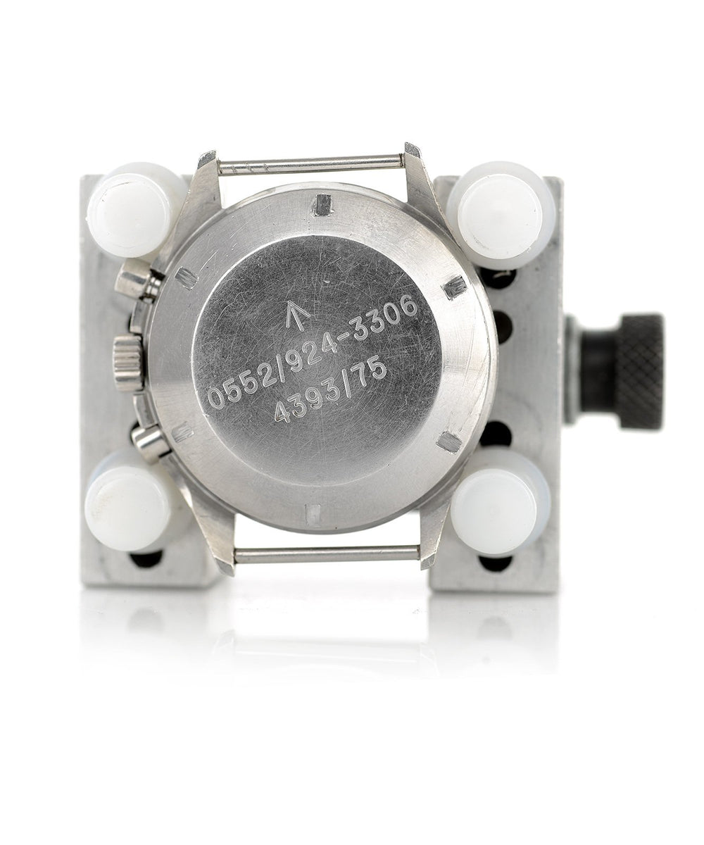 This is an extremely rare and desirable Lemania 818 chronograph made for the British Armed forces and delivered in 1975. Lemania were the exclusive supplier of chronograph wristwatches to the British military between 1945 and 1970. The watches they supplied during this period were single-pusher types, the reasoning being that with a single pusher there was less chance of an error in timing or accidentally stopping the chronograph. After 1970 the Ministry of Defence revised their chronograph specifications to allow for the less costly two-button type chronograph movements to be used and so opened up the chronograph supply to other manufacturers.