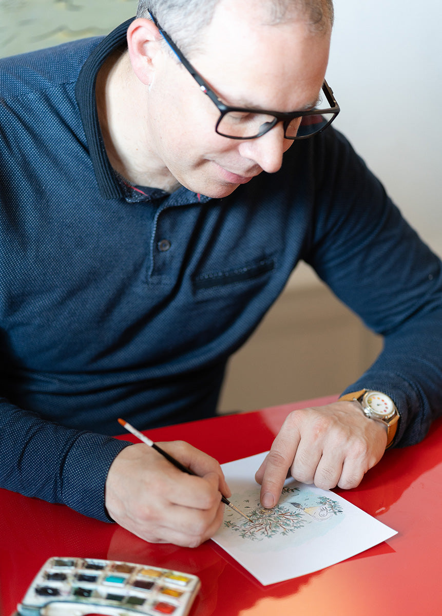Feathers and brushes, felt-tip pens and inks, the tools vary and the themes change according to the book.