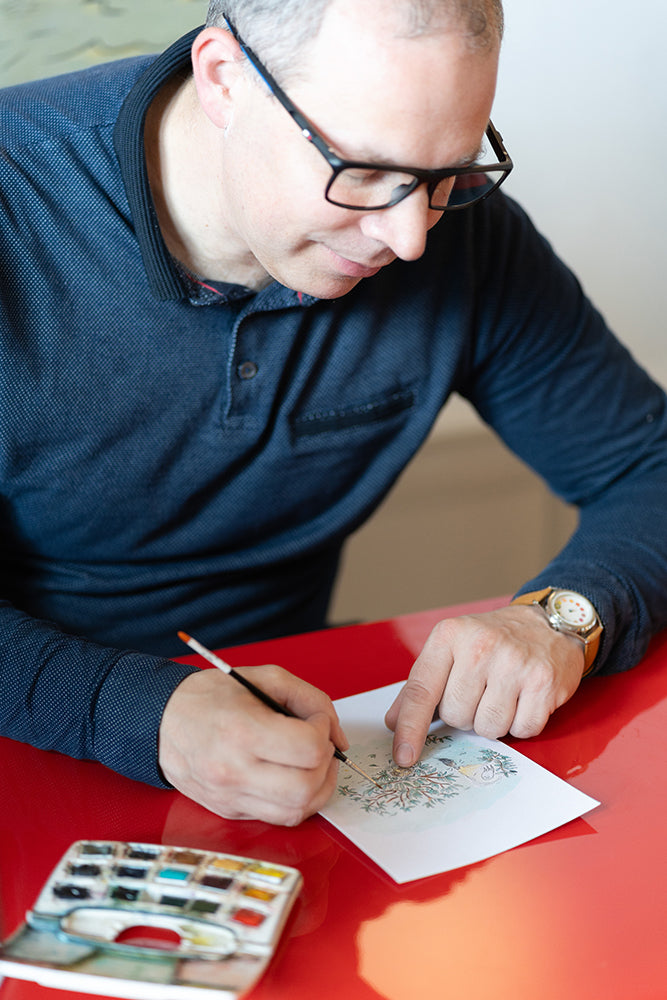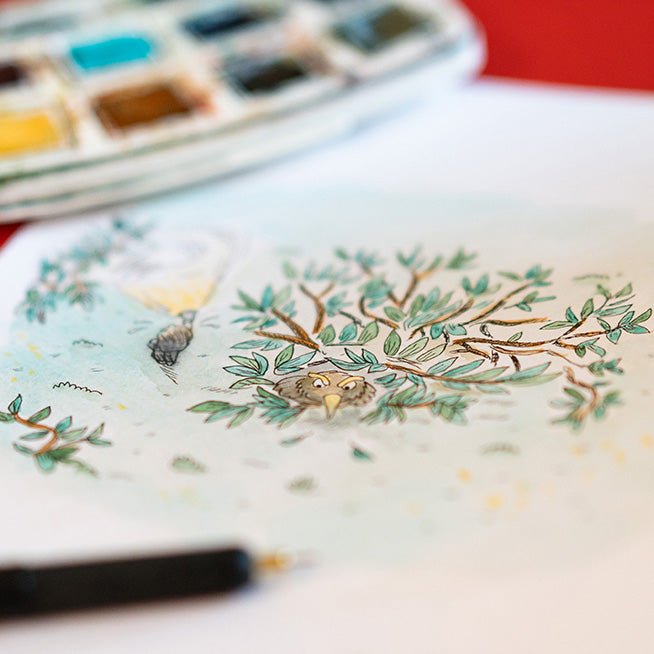 Feathers and brushes, felt-tip pens and inks, the tools vary and the themes change according to the book.