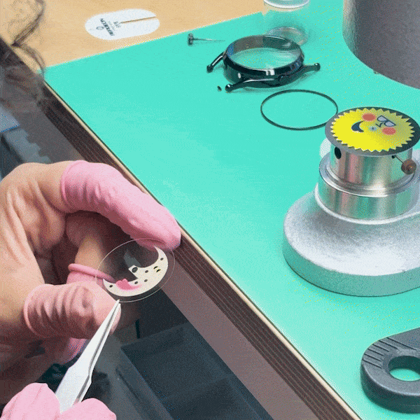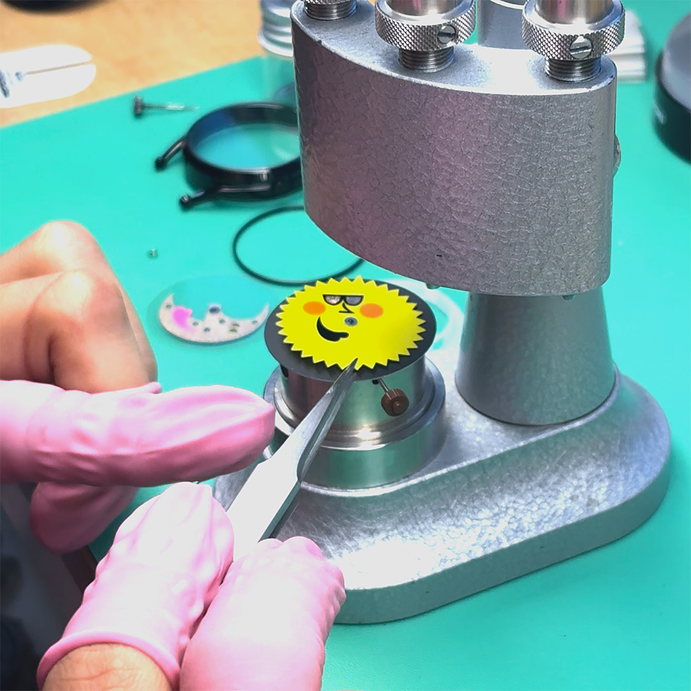 All the artwork for the eclipse design was hand cut from physical sheets of card. I often hand gild elements in gold or silver to add a feeling of animation. I was thrilled that MJW could take this aspect of my practice and include it in the watch.