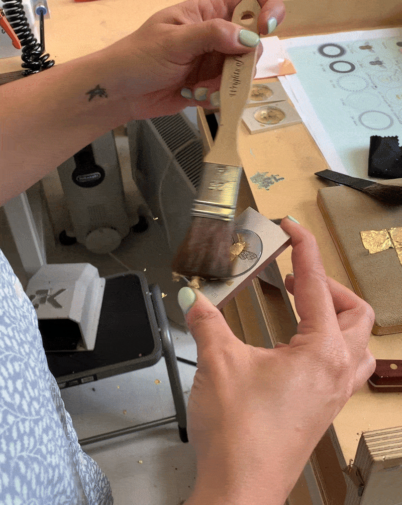 The precious metal foils were applied by hand, cleaned and backed with a varnish for protection.