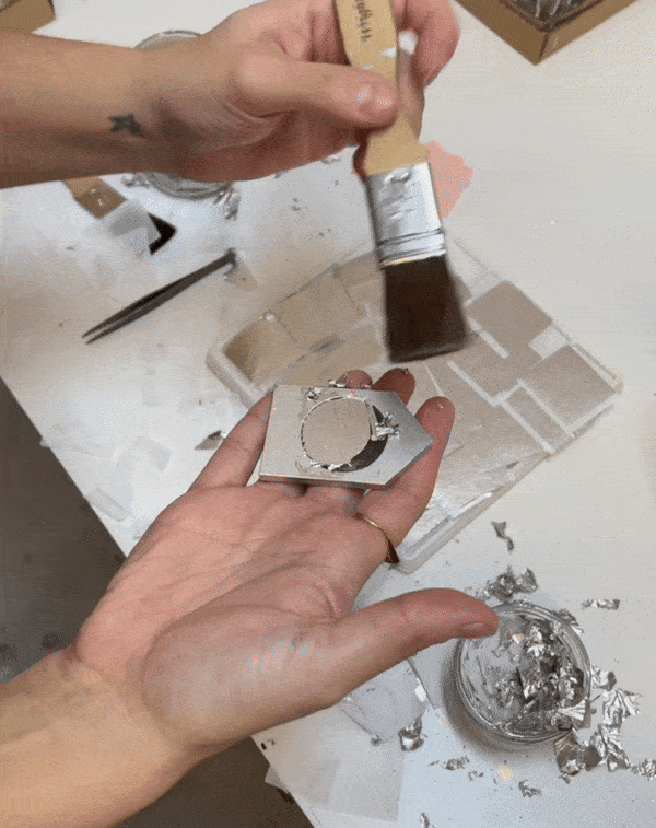 The precious metal foils were applied by hand, cleaned and backed with a varnish for protection.