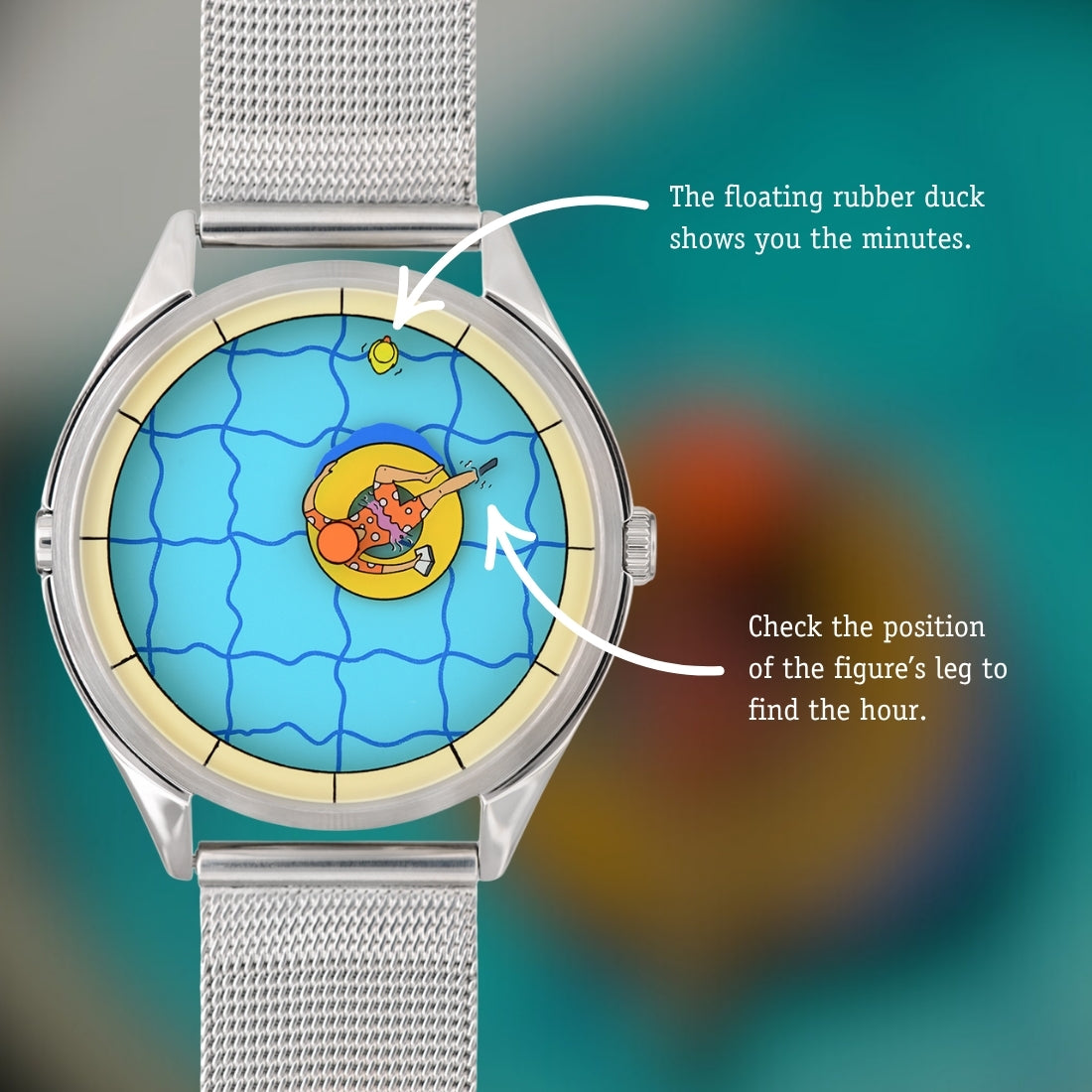 The circular form of the watch doubles as the pool. The sides are the tiles and they are perfect markers for the hours.